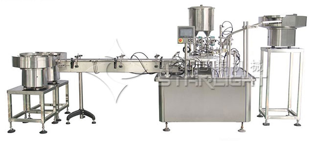 外用凝膠灌裝生產(chǎn)線外形結(jié)構(gòu)上可分為理管機和灌裝機兩個部分裝置,外套經(jīng)過整理進入理管轉(zhuǎn)盤,當(dāng)待灌裝的管子由輸送帶送入灌裝機,由工作機構(gòu)將管子送入工作主轉(zhuǎn)盤。由光電探測傳感器檢測是否有待灌裝的凝膠管存在,用于決定是否灌裝(有管灌裝、無管不灌裝)。灌裝槍自動下移進管內(nèi),凝膠自動注入管內(nèi)。帽蓋經(jīng)過自動落蓋機構(gòu)的整理,按順序進入該自動落蓋工位,有出料工位完成zui終灌裝成品的輸出。